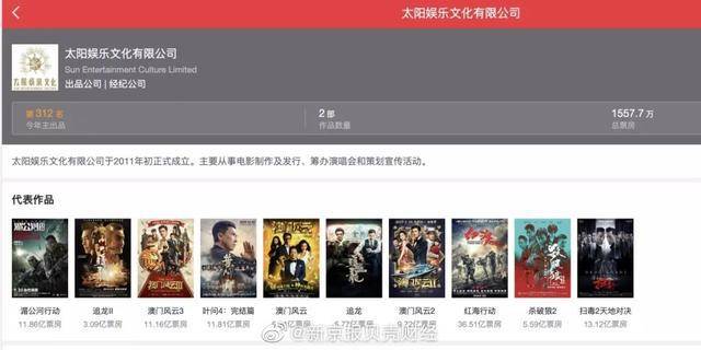 这其中,较为引人注目的当属太阳娱乐文化公司(简称“太阳娱乐”)。根据猫眼电影官网上显示信息显示,太阳娱乐于2011年初正式成立,是一家出品公司兼经纪公司。截至目前,太阳娱乐已推出多部影视作品。