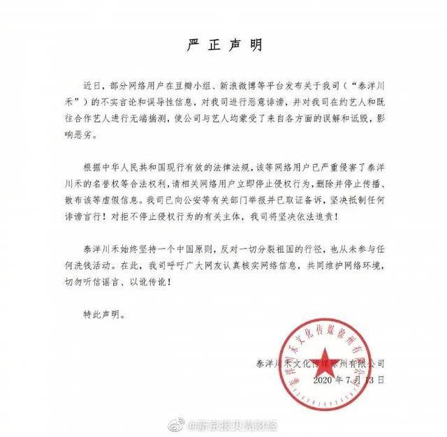 据了解,2020年7月,关于周焯华涉事的消息传出后,明星经纪公司泰洋川禾曾发布声明辟谣,称未参与任何洗钱活动,并已向公安等有关部门举报并取证备诉。