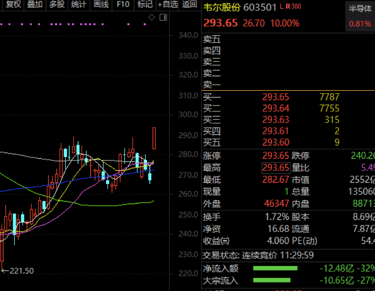 今天早盘涨势最好的龙头股,当属韦尔股份。该股以近6%的涨幅开盘,不到1分钟即封上涨停。截至上午收盘,该股报293.65元,上涨10%,总市值达到2552亿元。公开信息显示,韦尔股份是一家以自主研发、销售服务为主体的半导体器件设计和销售公司。