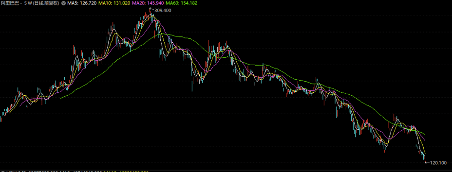 今天早盘,阿里港股大幅低开,盘中触及120.1港元,再创历史新低。 自此,阿里港股股价已经回撤逾60%。数据显示,去年10月底,该股最高股价达到309.4港元。以市值计算,该股最新市值2.2万亿元,相比高峰市值缩水近3.5万亿元,比茅台和五粮液最新市值总和还多。