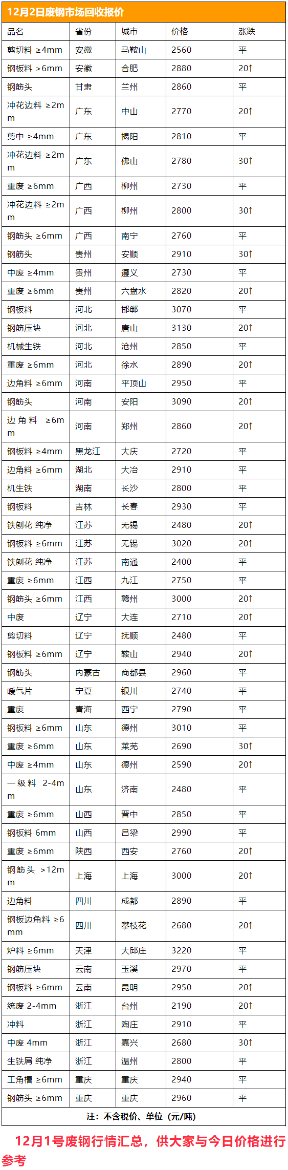 12月2日清远圣力到厂价上调30:重废3040,钢筋头3040,生铁硬钢3000,冲片碎料3000,厚料3000,中剪2950,小剪2770-2840,乱钢筋2930,刨丝2420-2520,统料2220-2320,不含税。