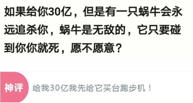 不得不说,现在网友们的脑洞可真大,就像下面这位网友问的问题,给你30亿,让蜗牛一直追杀乐虎国际app平台怎么样你, 但是碰一下就会死,你愿意吗?别说我愿不愿意,你要是能给我30亿我肯定立马同意,然后给它买跑步机,啊哈哈哈哈哈哈~