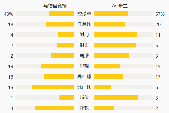 此后,双方均无建树。全场比赛结束,米兰客场1-0绝杀马竞,赢得本赛季欧冠首胜。