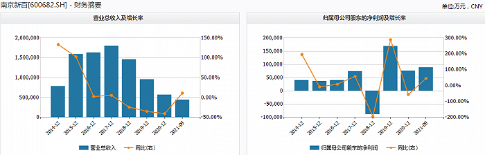 南京新百的业绩则有所缓解。2018年,南京新百曾亏损8.86亿元;2019年、2020年及2021年前9月,该公司分别实现归母净利润16.87亿元、7.52亿元、8.84亿元。