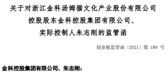 关于对浙江金科汤姆猫文化产业股份有限公司控股股东金科控股集团有限公司、实际控制人朱志刚的监管函