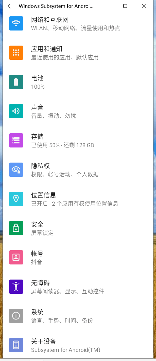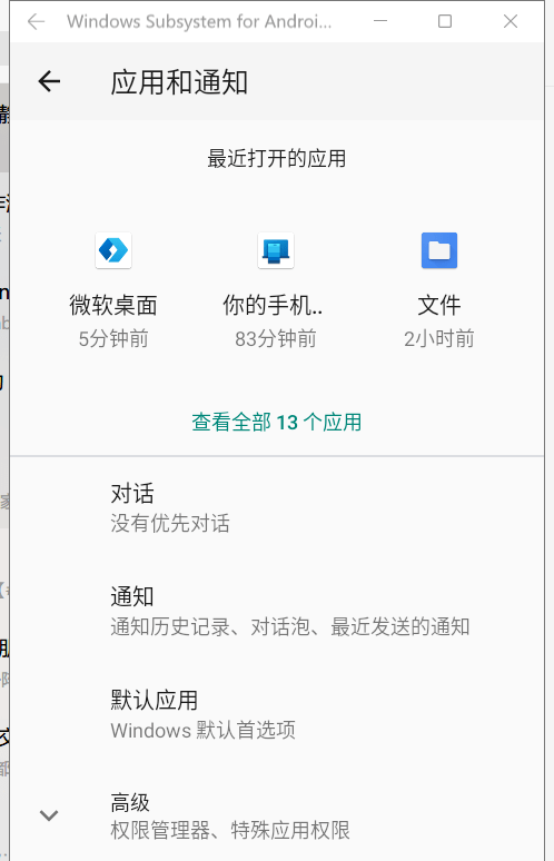 WSA 的设置界面只能访问安卓子系统的“文件”应用,其自带的系统设置被隐藏了。但是我们可以另辟蹊径去看看,方法是安装一个第三方的启动器(Launcher),例如微软的“微软桌面”。