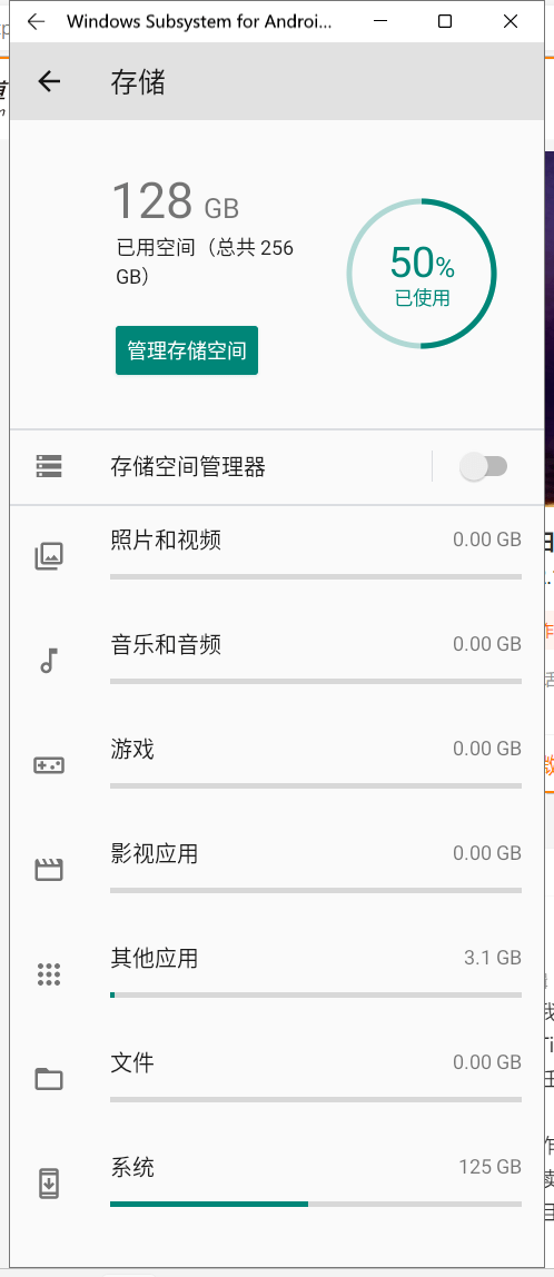 在这里可以发现,WSA 提供了 256GB 的虚拟存储空间(非实际占用),存储空间满了也是要清理的。