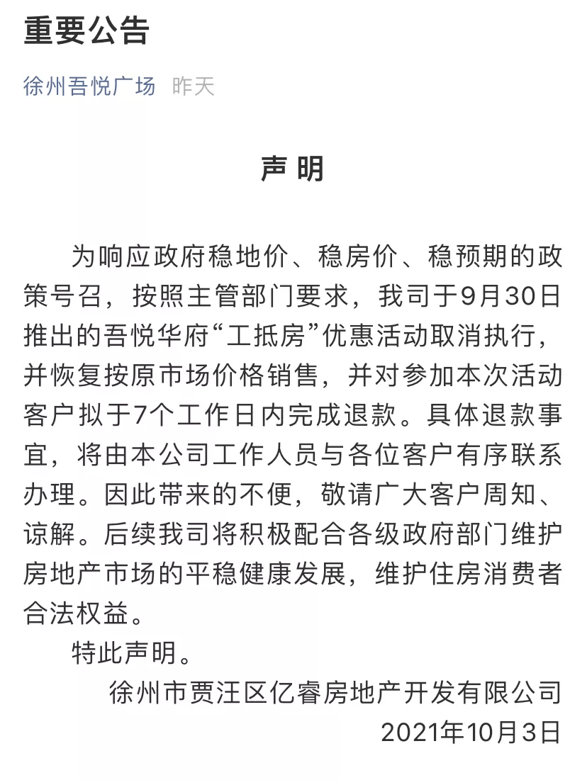 随后,亿睿公司发布声明称,吾悦华府“工抵房”优惠活动取消执行,并恢复按原市场价格销售。