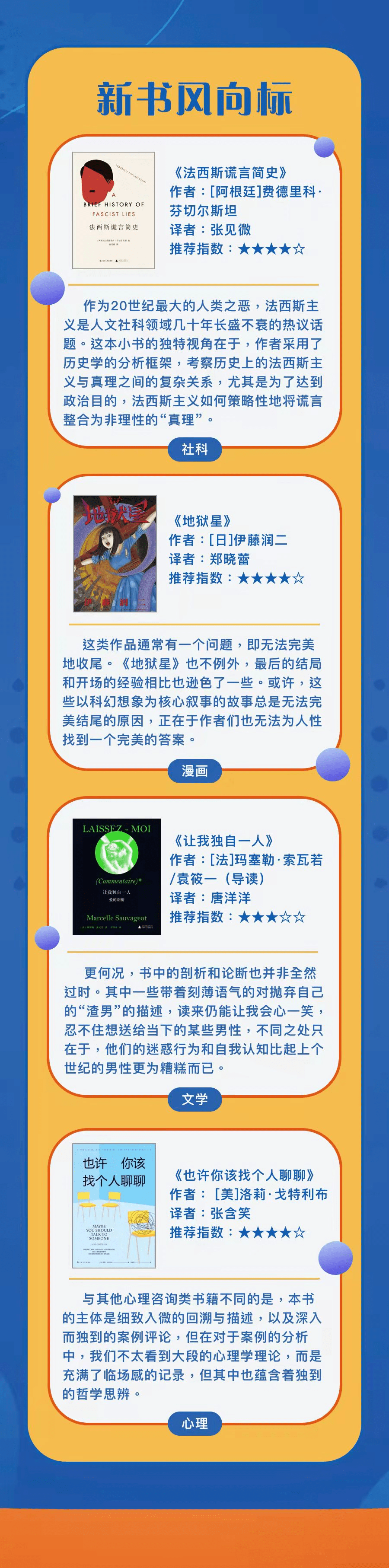 当然,任何阅读的判断都是个人的, 我们的意见未必正确,甚至有可能是偏见,但它们一定是真诚的。我们只是提供一个参考意见,希望为读者提供一份阅读指南(毕竟,这个事情可能还要冒着得罪出版社的风险)。如果你有比较犹豫的、想要知道我们态度的新书,欢迎在评论区留言,我们也将尽快给出自己的看法。