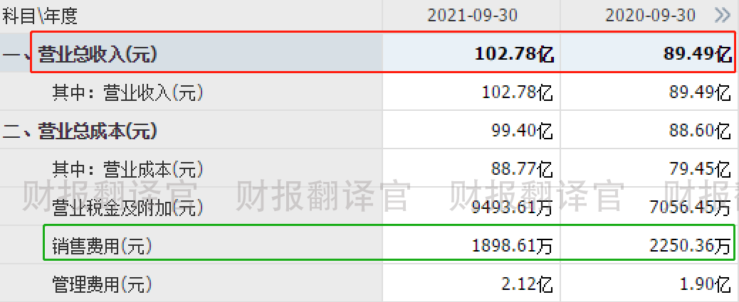 到了2021年第三季度,公司只用1899万元的销售费用,却创造出102.78亿元的营业收入,销售费用占比降至0.2%。