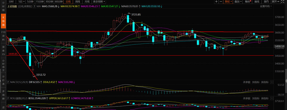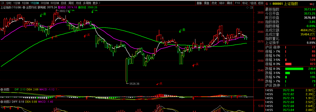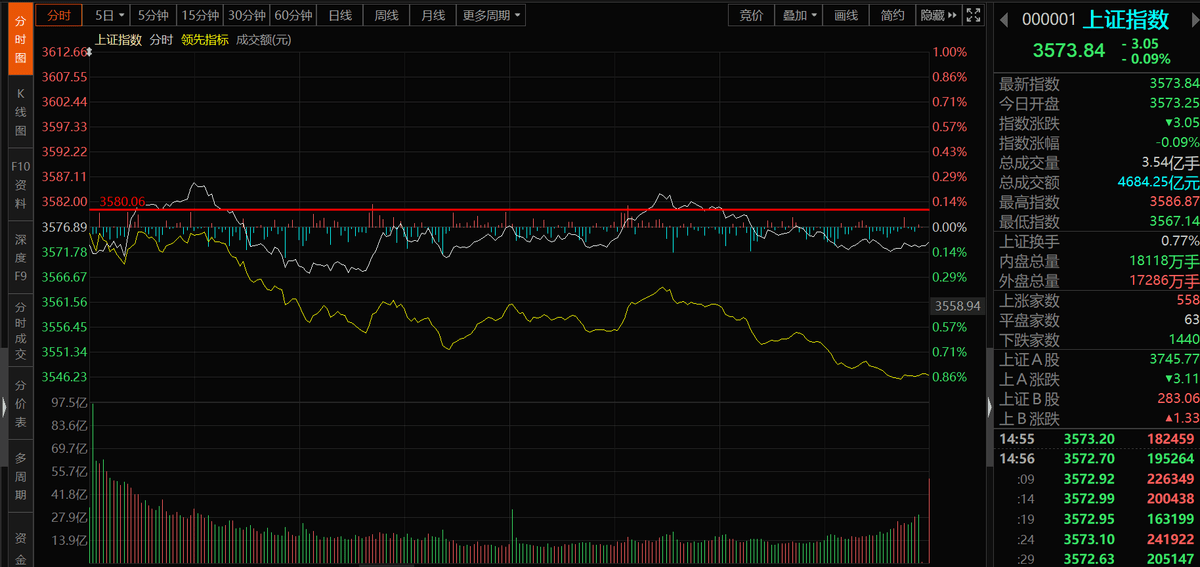 上证指数早盘尾盘五分钟均线横盘震荡早盘午后两次上攻3580失败后震荡回落破位五分钟均线趋势偏空,以逢高空为主。