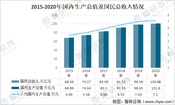 改革开放以来,中国经济发展一直保持了高速增长的态势。2020年中国国民总收入100.88万亿元,同比增长2.5%;国内生产总值101.6万亿元,同比增长3%;人均国内生产总值7.2万元,同比增长2.4%。