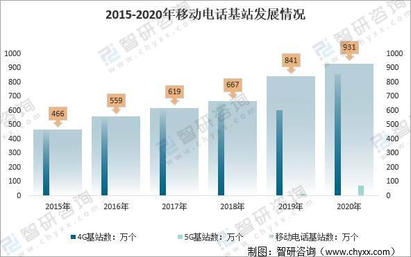 随着5G等新型基础设施建设与我国社会经济各领域融合的快速发展,为社会带来了巨大的效率和效益提升。2020年中国4G基站数从2015年的466万个增长到859万个;5G基站数从2019年的13万个增长到72万个,2020年中国移动电话基站总数达到931万个。