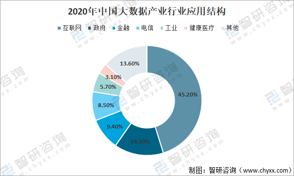 大数据技术的广泛应用,加速了数据资源的汇集整合与开放共享,形成了以数据流为牵引的社会分工协作新体系,促进了传统产业的转型升级,催生了一批新业态和新模式。从大数据产业行业应用结构来看,2020年中国大数据产业互联网规模占比最大,占45.20%,将近一半。