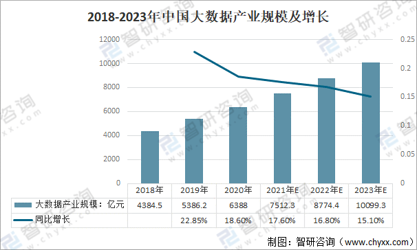 大数据与移动互联网的结合成为一体进入数字时代,,未来将服务于更多行业和领域。2018-2023年中国大数据产业规模呈现逐年增长趋势,2020年底,中国大数据产业规模6388亿元,较2018年增长2003.5亿元;预计2021年中国大数据产业规模7512.3亿元。