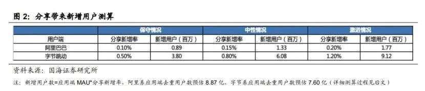 根据微信场景下用户分享行为数据,国海证券在今年9月份发布了一份定量测算报告显示,在分享外链可跳转原App的前提下,新增用户的数量级上,阿里和字节都将获得百万级的新增用户。