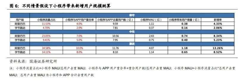 中性测算下,阿里系在微信小程序的MAU有望达2.43 亿,带来新用户增量7400万,新增率 8.34%;字节系在微信小程序的MAU有望达0.75亿,带来的新用户增量4000万,新增率 5.23%。
