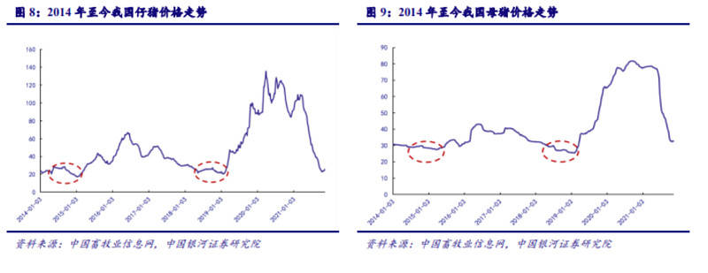 价格是供给与需求的共同反应,回顾历次猪周期,在猪价一次探底时期,猪仔和母猪价格同时会出现探底阶段,猪价二次探底高于第一次探底,而猪仔和母猪价格的二次探底会更深。