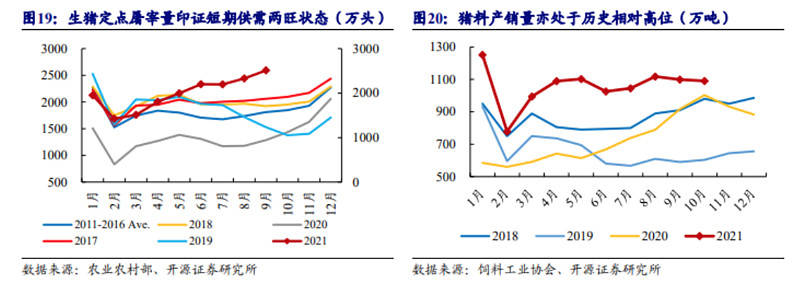 今年6-10月全国规模以上屠宰量同比分别增长65.8%、87.4%、97.5%、95.2%、111%,生猪出栏快速上升。今年6月全国能繁母猪存栏现拐点,7-10月能繁母猪存栏环比下降5.7%,然而,10月以来猪价超预期上涨,随着低效母猪出清,母猪效率正持续改善。