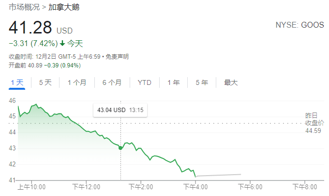 继昨天暴跌7.42%之后,今日美股开盘前,加拿大鹅股价再次小幅下跌。