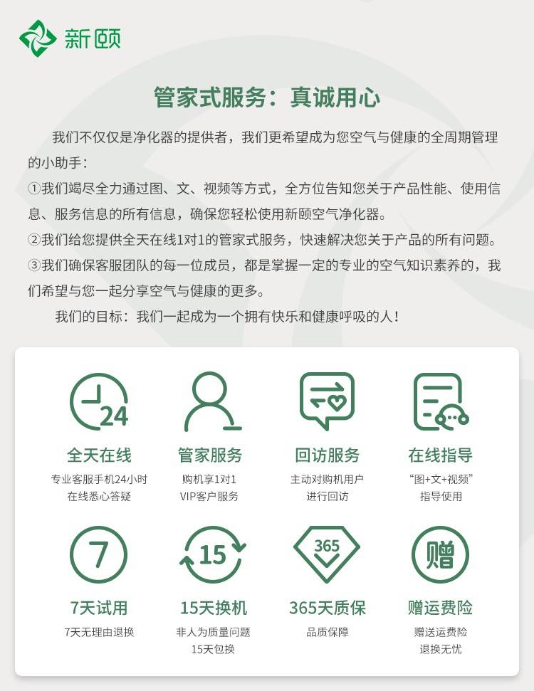 我们研究了一下新颐的服务理念,他们认为:空气净化器是一个功能性的产品,而且对很多用户来说是一个新型的电器产品,因此服务质量对品牌的建立与巩固起到非常关键的作用!