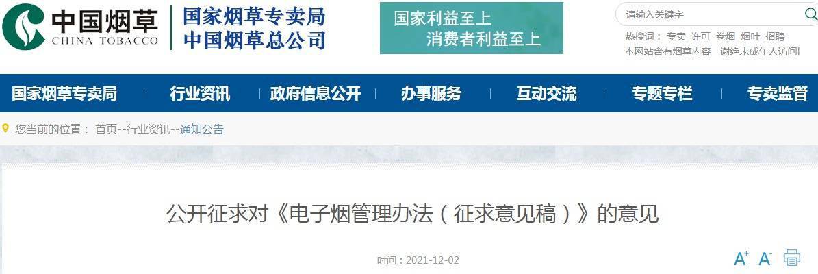 消息面上,国家烟草专卖昇的源体育在线局网站12月2日信息显示,国家烟草专卖局2日就《电子烟管理办法(征求意见稿)》公开征求意见。《管理办法》共六章四十八条。