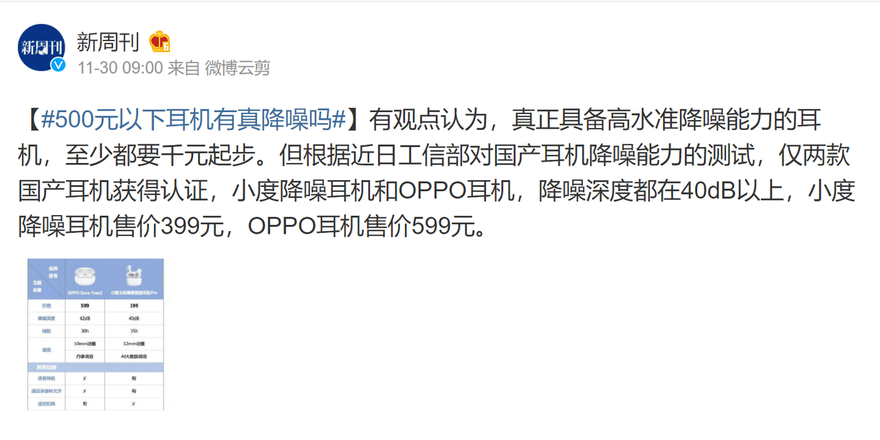 然而回到实际,很多TWS降噪耳机可能并没有官方说得那么美好。之前央视就有报道,表示市面上有着近五成的降噪耳机降噪音量不足。为此工信部也是亲自下场,对部分国产降噪耳机进行了测试。从测试的结果来看,通过检测的仅有OPPO家的OPPO Enco Free2以及小度降噪耳机这两款产品。其中小度降噪耳机售价399元,OPPO Enco Free2售价599元。