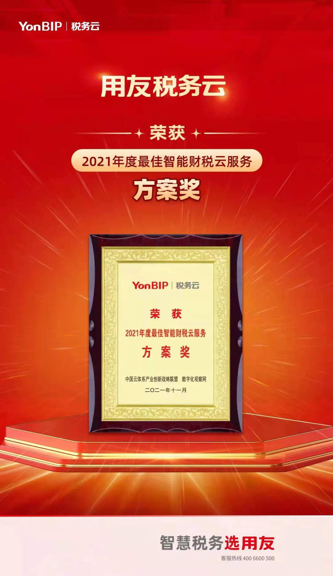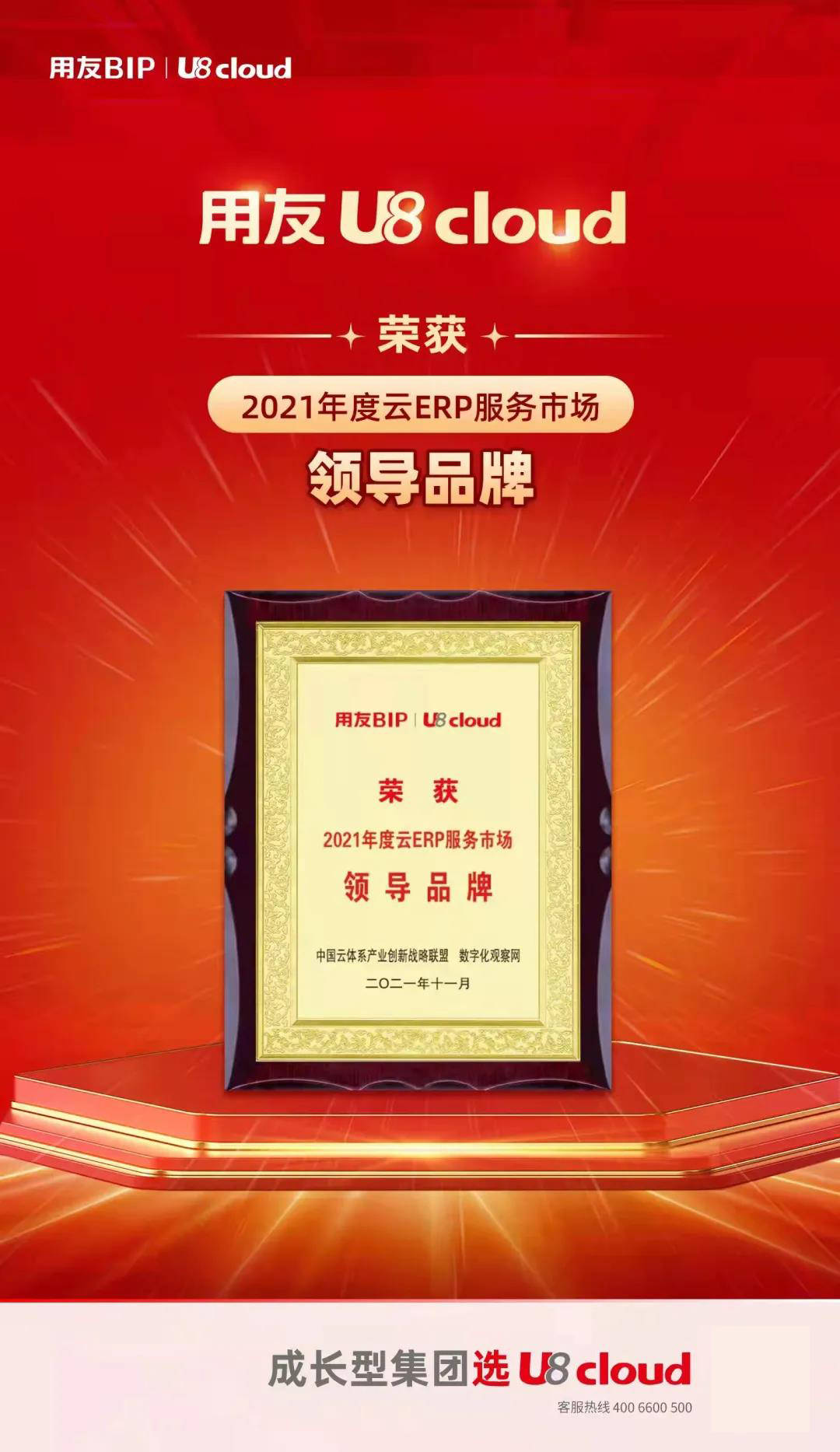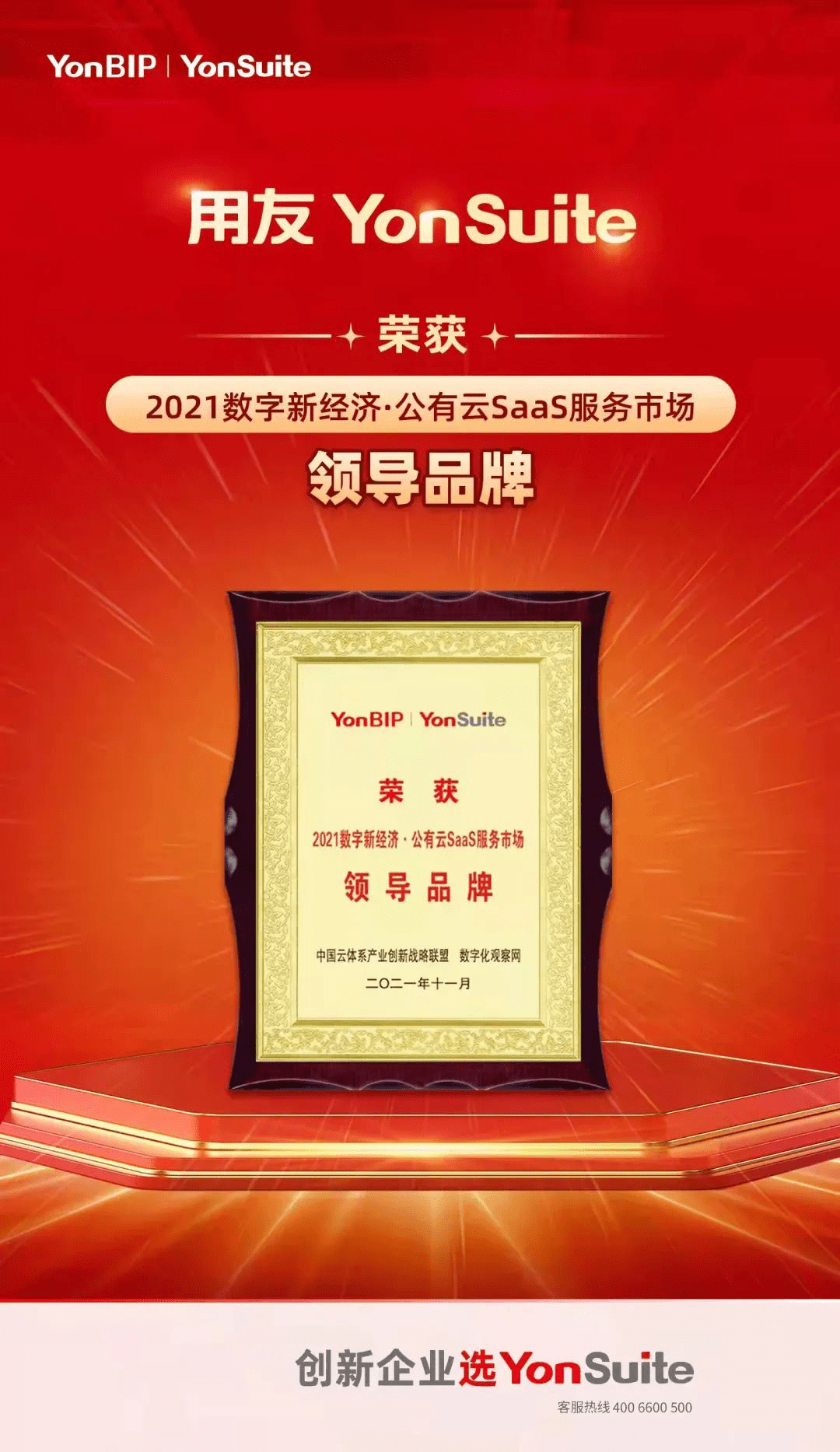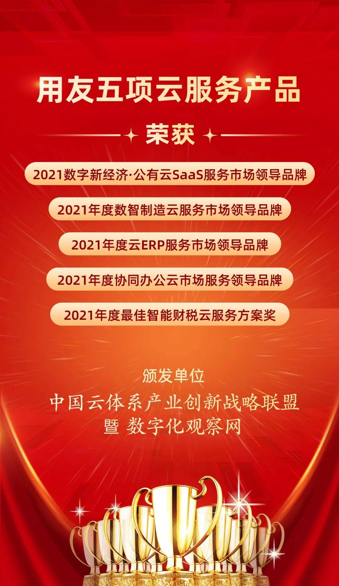 2021年11月30日,用友五项云服务荣获“数字中国•云领未来”(第三届)2021数字新基建 中国云体系产业年度评选领导品牌及最佳云服务方案奖。