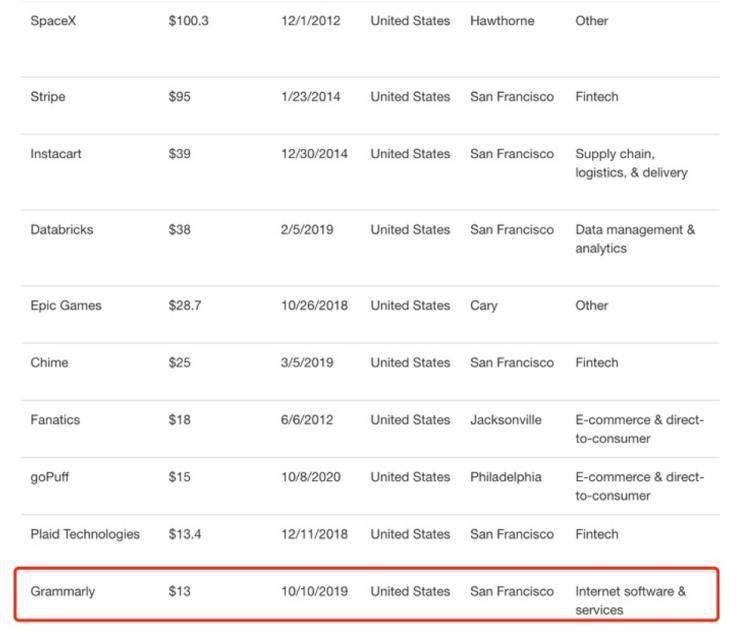 Grammarly 最新估值排名全美独角兽第十位,图片来自 Crunchbase