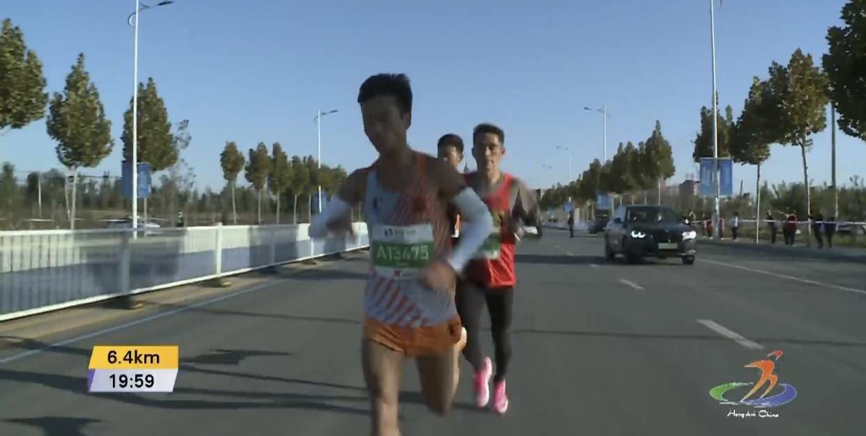 比赛进行约20分钟后,男子第一集团来到6.4公里处,配速约每公里3分08秒,杨定宏和管油胜二人交替领跑,此外包毕力格也紧跟二人身后处在第一梯队。