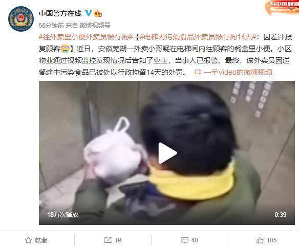 目前,该外卖员因送餐途中污染食品已被当地警方处以行政拘留14天的处罚。