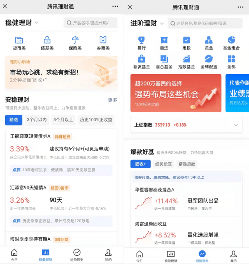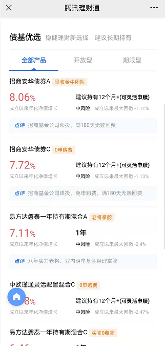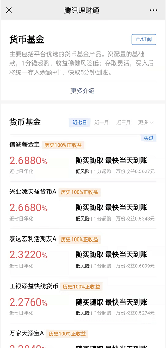 作为腾讯旗下官方理财平台,腾讯理财通上线了货币型基金、债券型基金、混合型基金、指数型基金、股票型基金、FOF基金等多类基金产品。基金种类丰富,投资者可以在腾讯理财通平台按需购买,打开【微信】-【我】-【支付】-【理财通】,即可进入。