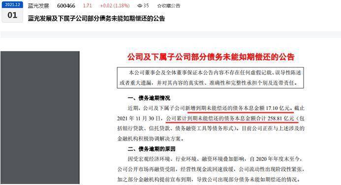 蓝光发展12月1日披露《蓝光发展及下属子公司部分债务未能如期偿还的公告》显示,近期,公司及下属子公司新增到期未能偿还的债务本息金额 17.10 亿元。截止 2021 年 11 月 30 日,公司累计到期未能偿还的债务本息金额合计 258.81 亿元(包括银行贷款、信托贷款、债务融资工具等债务形式)。