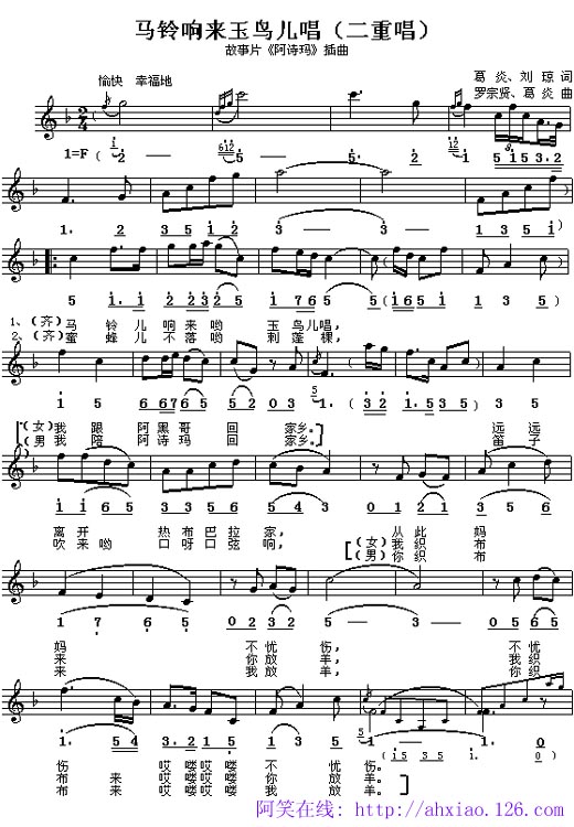 《马铃响来玉鸟儿唱》钢琴谱 胡松华 杜丽华 点这里