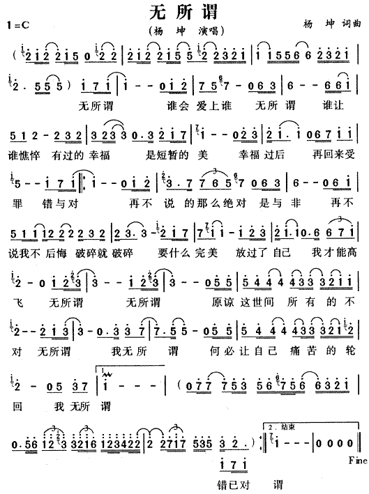 《无所谓》简谱 杨坤