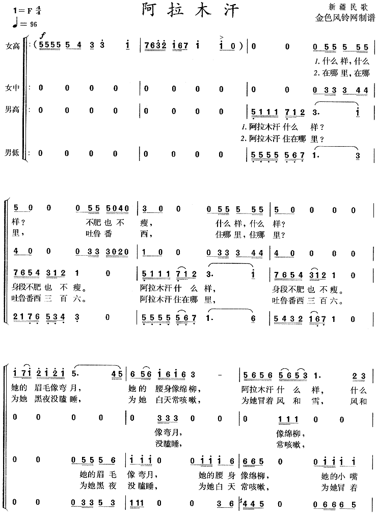 《阿拉木汗(新疆民歌)》简谱