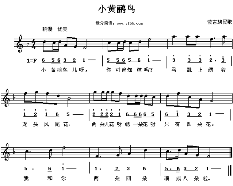 《小黄鹂鸟》简谱 蒙古民歌
