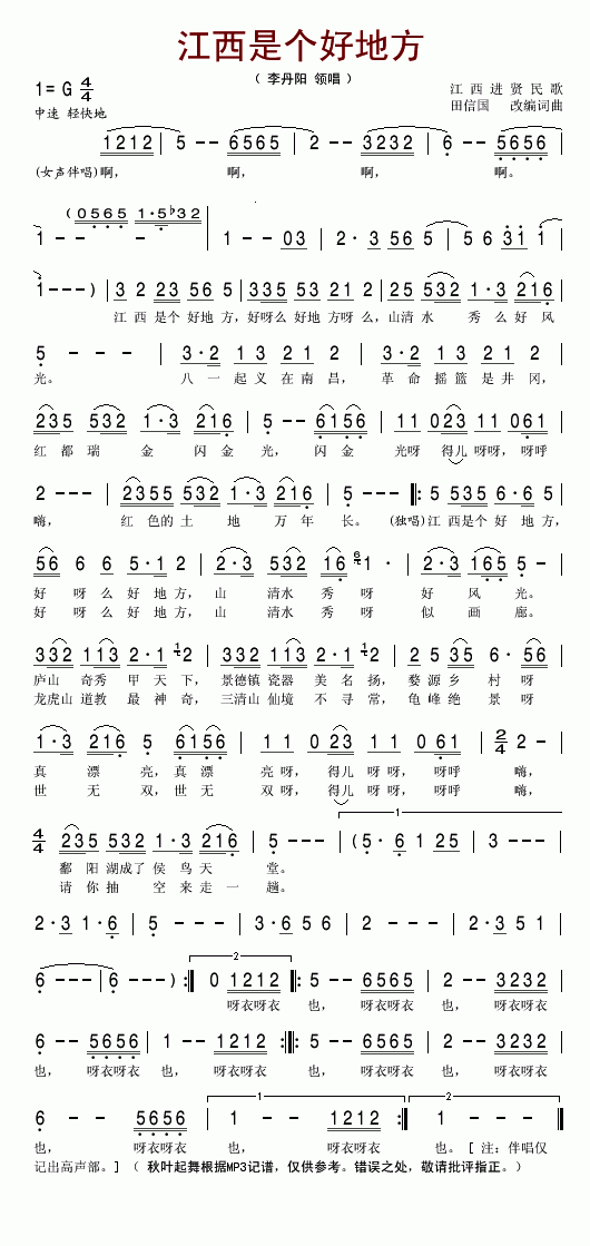 《江西是个好地方》简谱 李丹阳