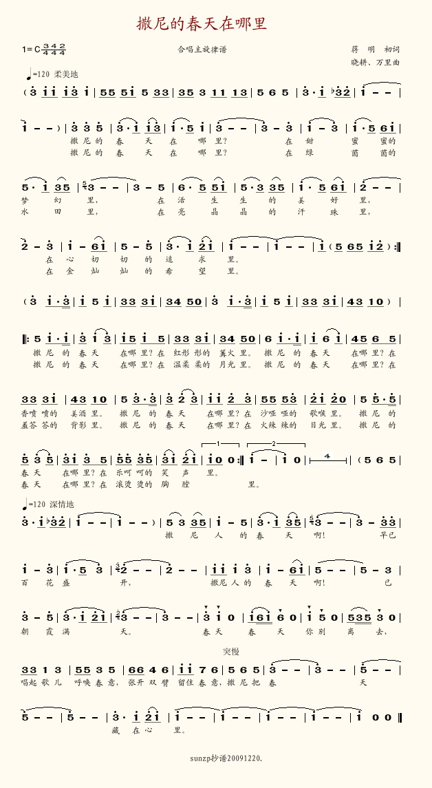 《撒尼的春天在哪里》简谱 云南歌舞团 唐建中领唱