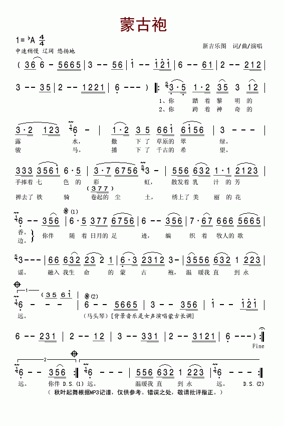 《蒙古袍》简谱 新吉乐图