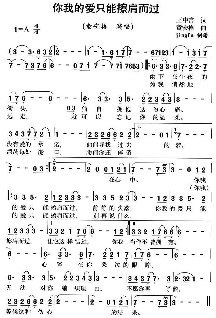 《你我的爱只能擦肩而过》简谱 童安格 点这里