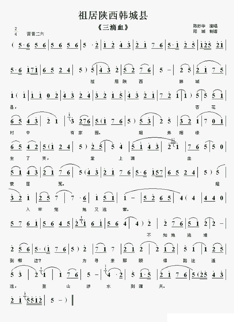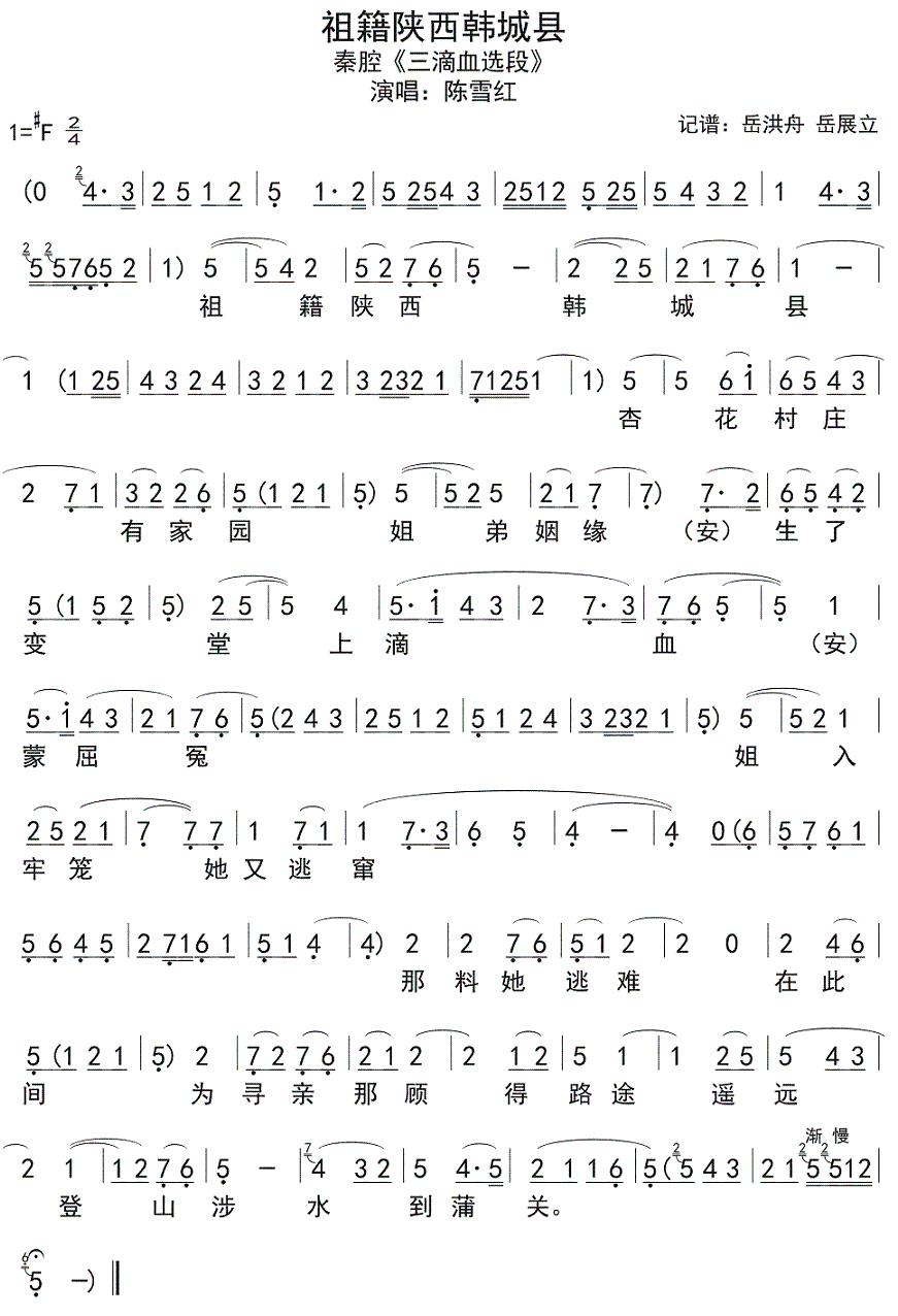 《[秦腔]祖籍陕西韩城县(《三滴血》选段 )》简谱 陈雪红