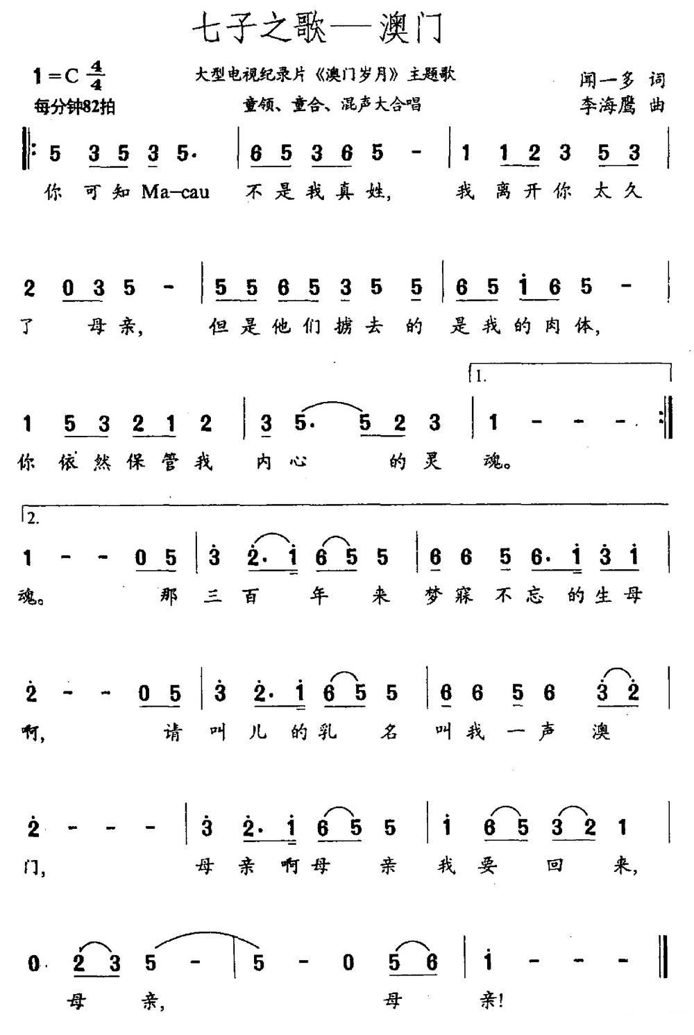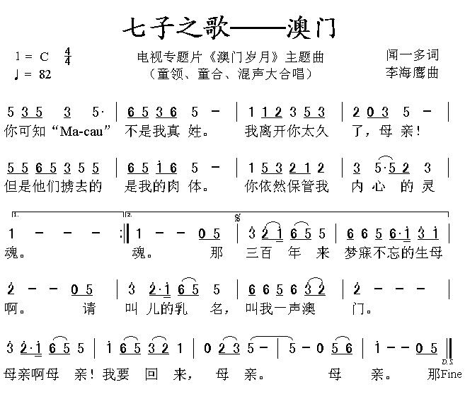《七子之歌——澳门(《澳门岁月》主题曲)》简谱 容韵琳等