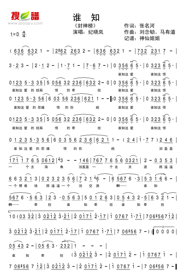 《谁知 《封神榜》插曲》简谱 纪晓岚