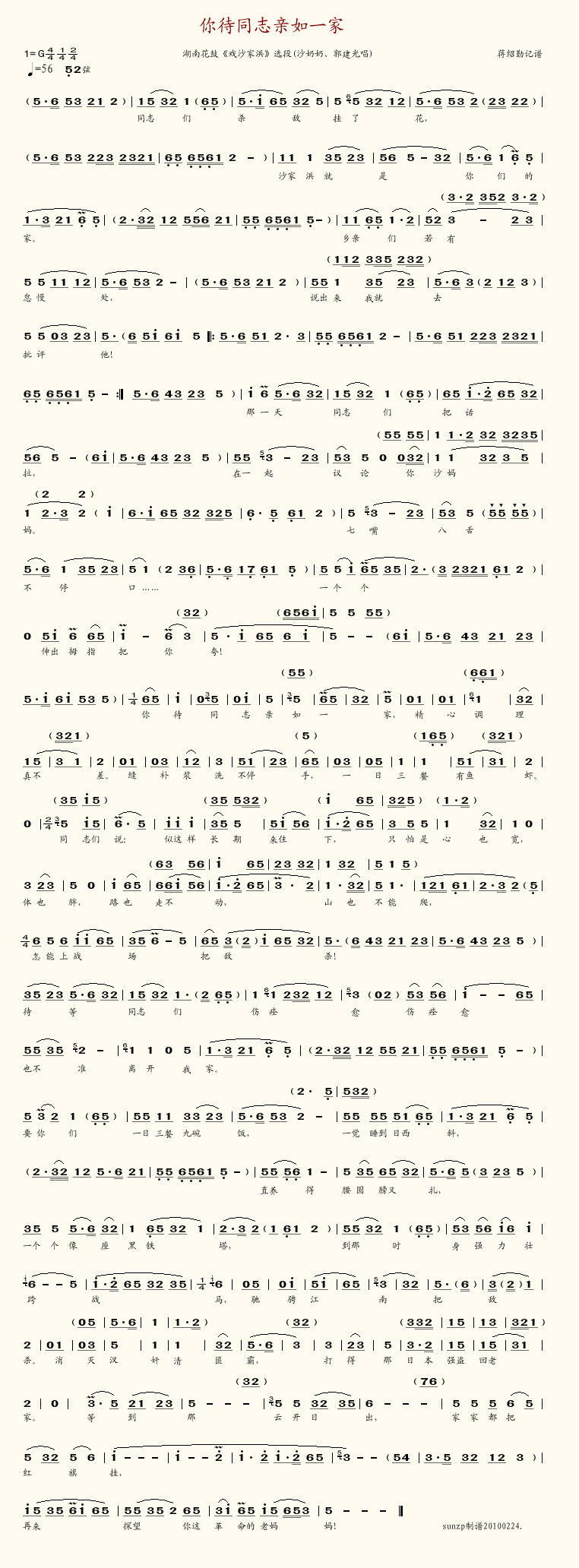 《你待同志亲如一家(湖南花鼓戏《沙家浜》选段)》简谱 刘镇兰 田既安