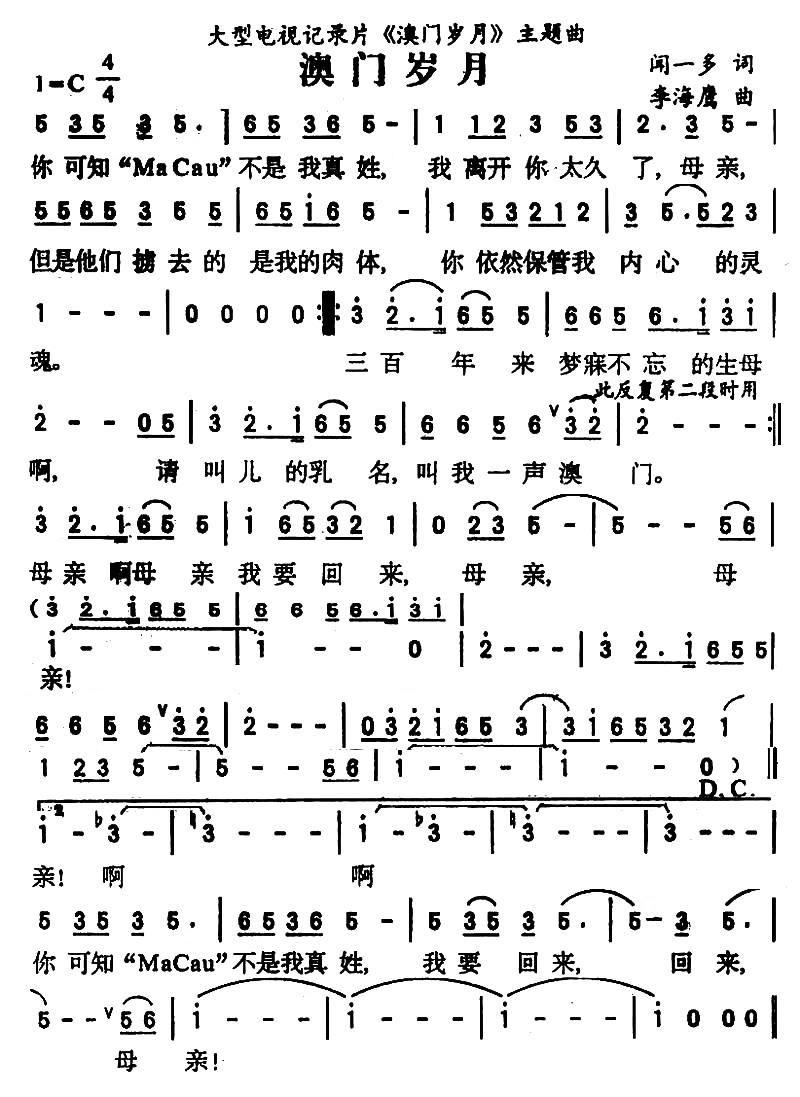 《澳门岁月》简谱