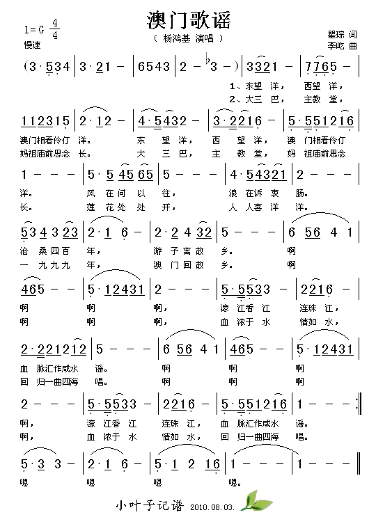 《澳门歌谣》简谱 杨鸿基