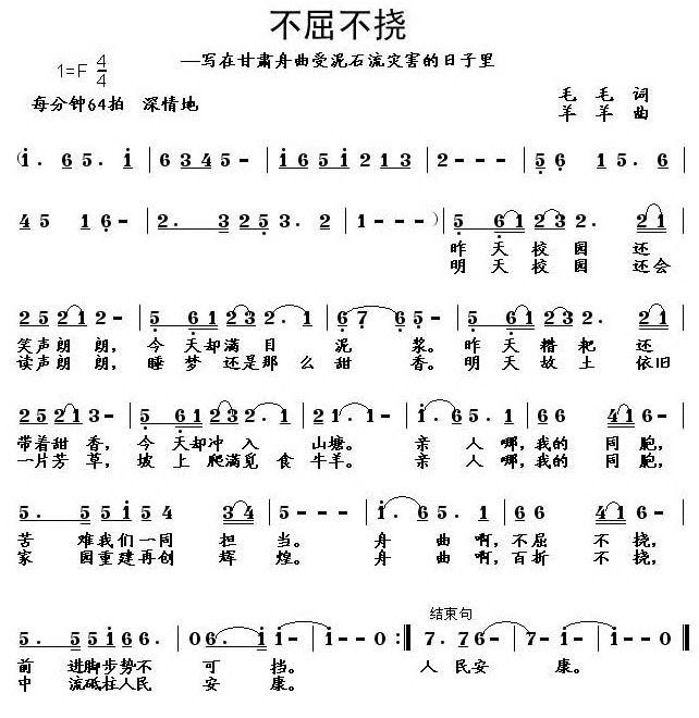《不屈不挠——写在甘肃舟曲泥石流灾害的日子里》简谱
