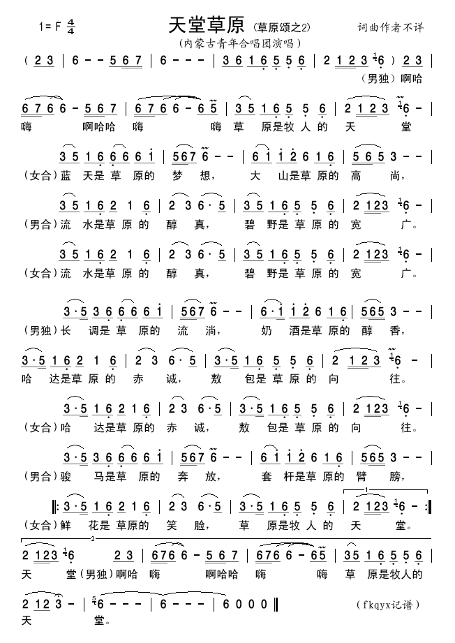 《天堂草原(草原颂之2)》简谱 内蒙古青年合唱团