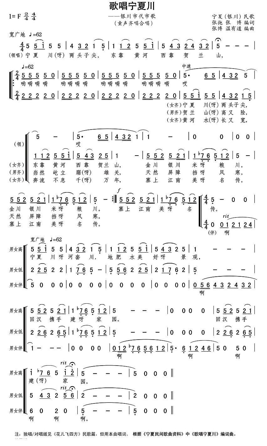 《歌唱宁夏川(张弛词曲、童声合唱)》简谱
